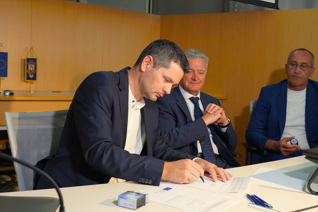 Direktor Vodovoda i odvodnje d.o.o. Šibenik, dipl.iur. Zvonimir Štrkalj i vlasnik tvrtke Jadranski ronilački servis d.o.o., gospodin Ivica Gulin u nazočnosti gradonačelnika Šibenika dr. Željka Burića potpisali su danas Ugovor o izvođenju radova Vodoopskrbni cjevovod kopno, Prvić, Obonjan, Kaprije i Žirje.